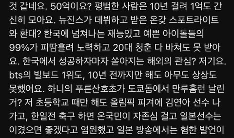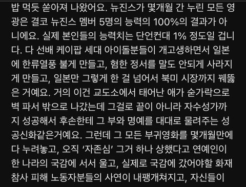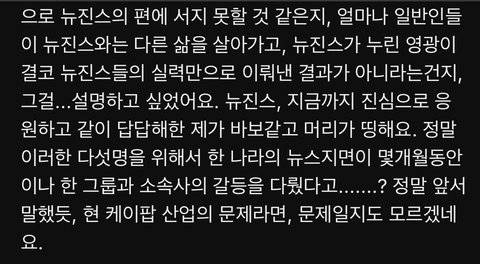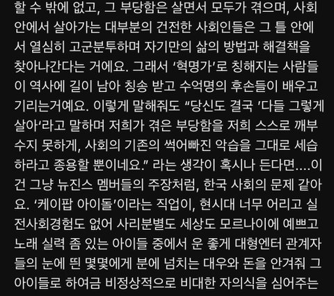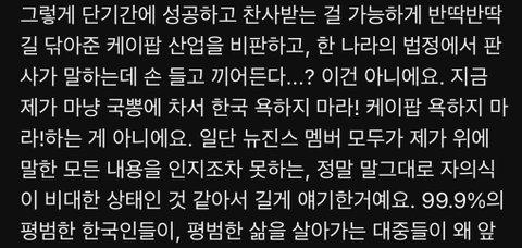 정말 명문이다. 케이팝의 진짜 문제라면 작사 작곡 가창력 무엇 하나 뒷받침되지 않는 뉴진스 같은 그룹이 대형기획사와 트렌디한 프로듀서 만나 단숨에 해외 진출해 유명해지고 한방에 50억을 버는 것이 아닌가 싶다