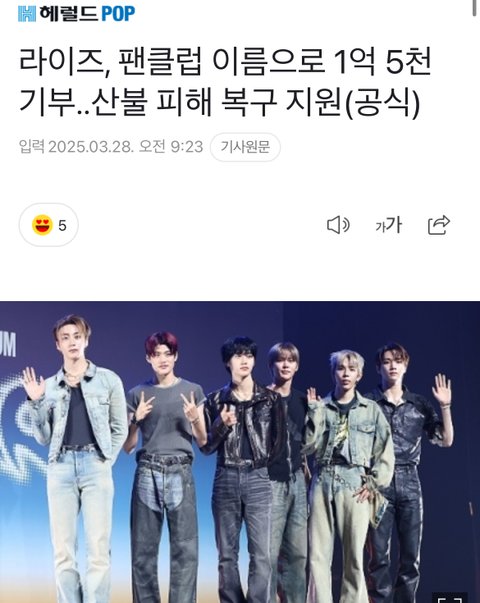 이번 기부는 라이즈가 공식 팬클럽 브리즈(BRIIZE)의 이름으로 산불 피해지역 주민을 돕기 위해 이루어진 것으로, 앞서 라이즈는 취약계층 청소년들의 꿈과 희망을 응원하며 꾸준한 나눔을 실천해온 바 있다.