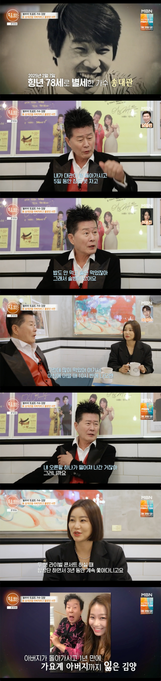 김양은 송대관을 언급하며 “각별하다 못해 진짜 아버지같은 분이었다”라며 남다른 인연을 언급했다. 태진아는 송대관에 대해 “내 오른팔 하나가 떨어져 나간거다”라고 말하며 보고싶은 마음을 전했다.