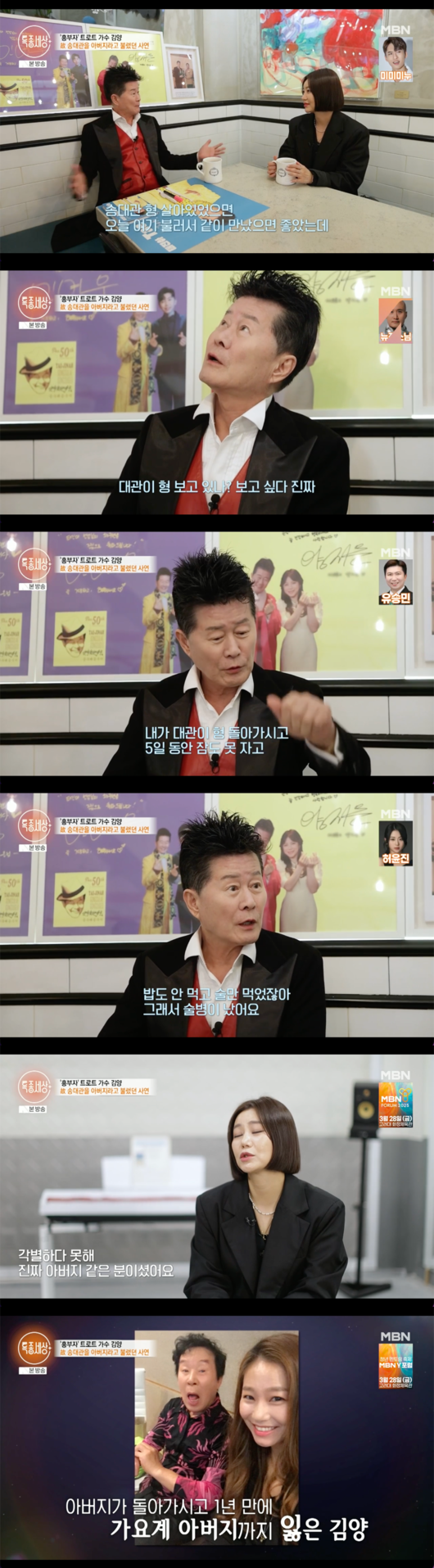 김양은 송대관을 언급하며 “각별하다 못해 진짜 아버지같은 분이었다”라며 남다른 인연을 언급했다. 태진아는 송대관에 대해 “내 오른팔 하나가 떨어져 나간거다”라고 말하며 마음을 전했다.