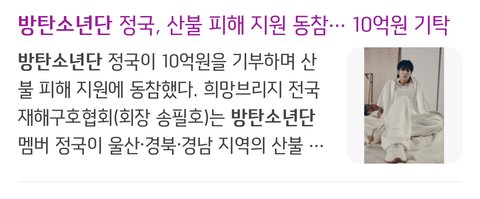 사람은 위급할때 진짜 모습을 알수 있는데 방탄 정국이 좋은 사례인듯... 기부 스케일 너무 멋있음