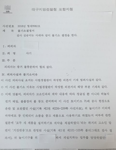 저는 관할이 포항북부경찰서 였으므로 다른 경찰서는 이 사건을 어떻게 처리할지는 정확히 알 수 없습니다. 하지만 제 경험이 사례로 있으니 포항북부경찰서 관할에서 계약을 하게 되는 경우는 꼭 계약서에 ‘새것’이라는 문구를 기재해야 한다는 점을 말씀드리고 싶습니다.제 사건이 사기라고 확신하기에 SNS에 문의 내용을 올렸지만 경찰은 이 사건이 사기가 아니라고 판단하여 오히려 명예회손까지 된 사실이 있습니다. 몰랐던 사실인 만큼 모두가 알게 되어 저와같은 금전적 피해가 발생하지 않았으면 하는게 이 글의 취지이고 제 바람입니다.