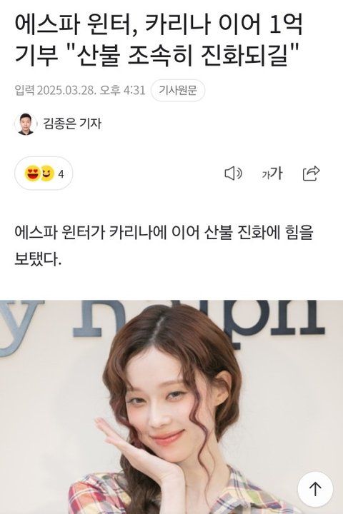 카리나 이어 윈터 1억 기부하네 진짜 내돈으로 기부하는게 힘든데 마음씨도 예쁘네 멋있다 윈터 팬들도 기부 했네..