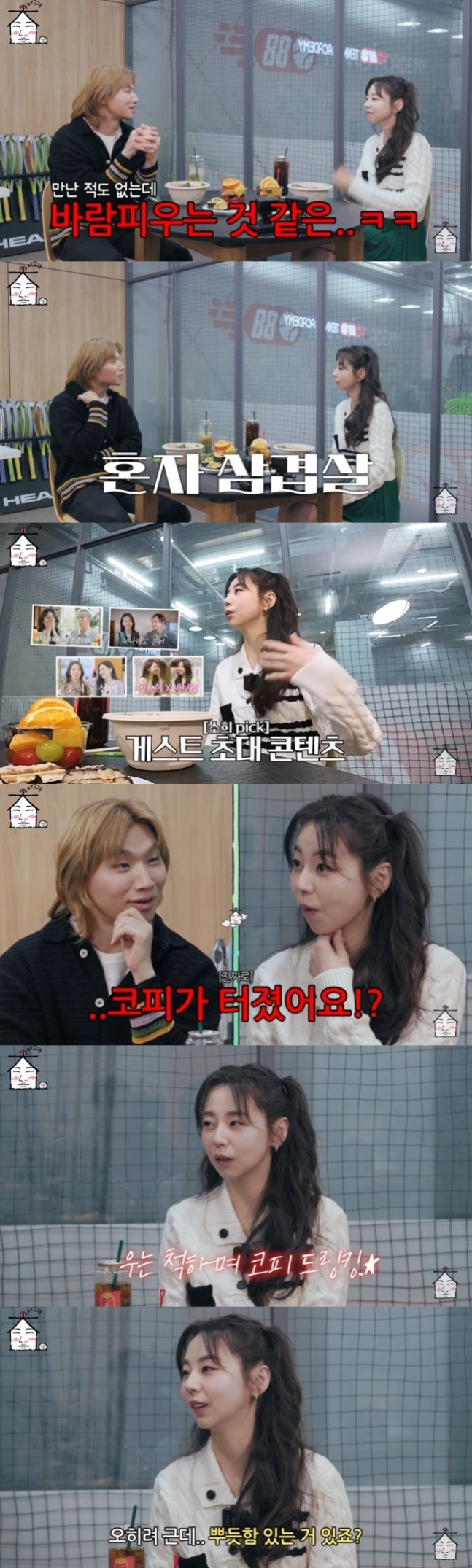 다양한 키워드를 적어 놓은 대성은 “저는 그게 호스트의 기본 예의라고 보고, 게스트분들이 ‘되게 편하게 놀고 가요’라는 말을 해줬을 때 오는 기쁨이 공부할 때 괴로움보다 훨씬 크더라”고 말했다. 안소희는 자신의 콘텐츠에 나와달라고 섭외를 시도했고, 대성은 “저야 뭐. 아까 어차피 제 출연권도 얻었으니까”라고 출연을 약속한 뒤, 안소희에게 리액션 비결도 전수했다.