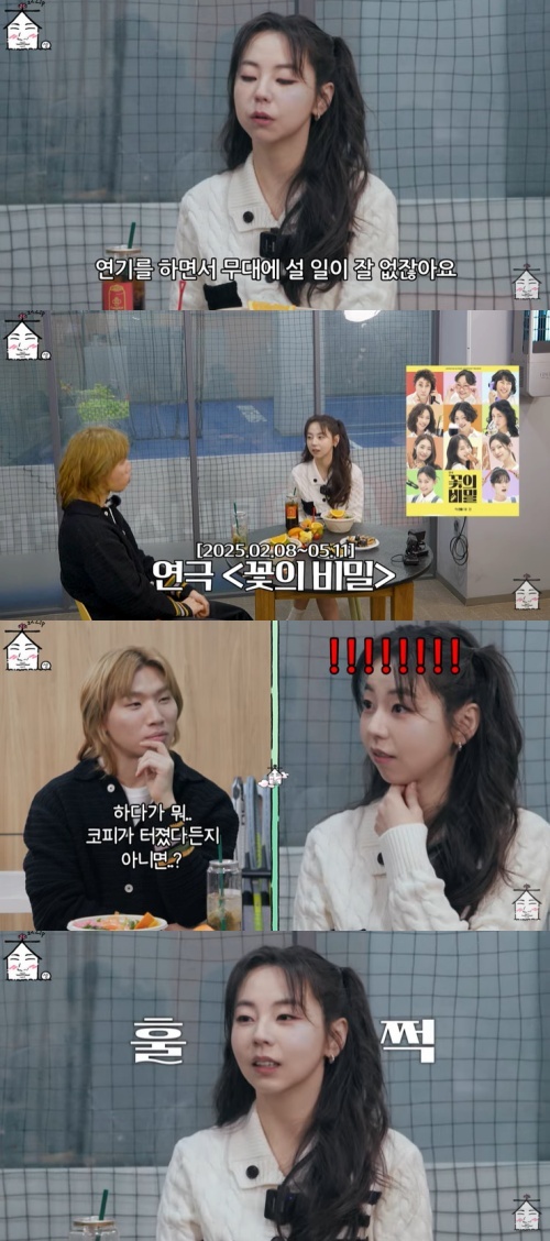 유튜브 '집대성' 화면 캡처이를 듣던 대성이 "연극 중 생긴 에피소드 있나? 하다가 코피가 터졌다든지?"라고 묻자, 안소희가 "어? 네!"라면서 깜짝 놀랐다.