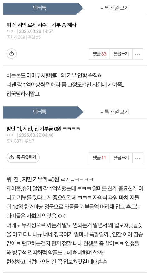 계속 같은 글╋댓 도배하는 정병임 먹금하고 댓 금지 어차피 말 안 통함 그래봤자 뷔가 기부 안 한것도 아님 10억넘게 했고 기부는 강요가 아님