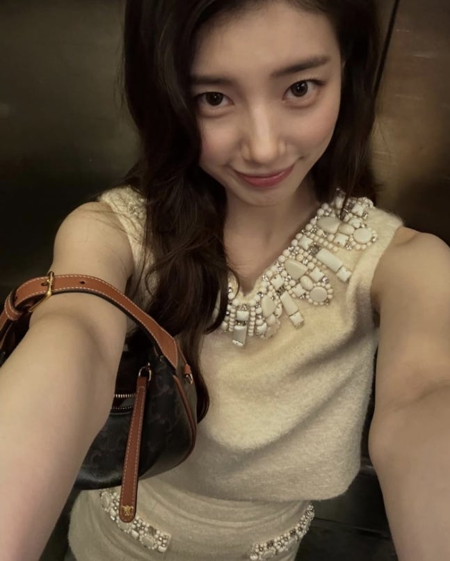 수지는 블랙 앤 화이트 스트라이프 민소매 니트 톱에 루즈한 데님 팬츠, 그리고 허리 라인을 감싸는 금장 H 벨트 포인트까지, 자연스러운 룩 안에 절제된 고급스러움을 담아냈다.사진=수지 SNS