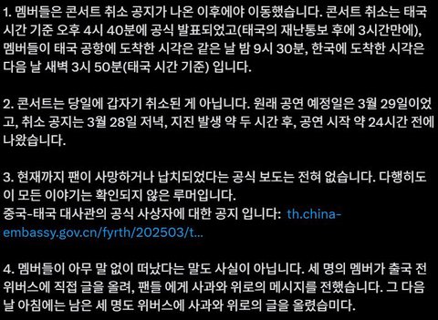 여러분 여러 루머들이 떠돌고 있더라고요 1.보이넥스트도어는 당일에 공연취소를 했다 - 거짓이에요.24시간전에 취소공지를했습니다 2.중국인 팬 4명이 죽었다 - 아닙니다 중국대사관에서 사상자 없다고 밝혔습니다 3.보넥도는 아무말없이 떠났다 - 시간을 다 계산했을때 3명의 멤버가 위버스에 글을 올리고 입국했습니다 4.보넥도가 취소공지가 올라오기도 전에 떠날준비를했다 - 보넥도가 공항에 도착한시간 9시30 취소 공지는 4시반에 올라왔어요 복사해서 멀리멀리 퍼트려주세요(복사본) 중녀들도 도배하는데 왜 우리는 정확한 사실 도배도 못하게 함?—원도어들 이거 모두 사실관계 다 확인한거니까 널리 퍼트려줘.