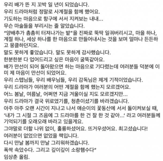 편지 속 임상춘 작가는 "우리 배가 뜬 지 꼬박 일 년이 되었다"며 "우리 드라마처럼 정말로 사계절을 함께 했다"고 말문을 열였다.