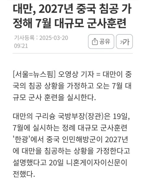 대만 침략 성공하면 그 다음은 우리나라일거라고 하네요.