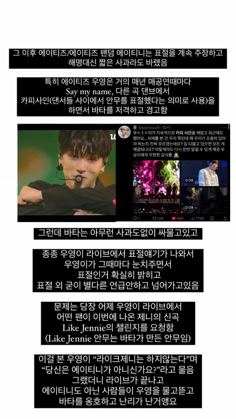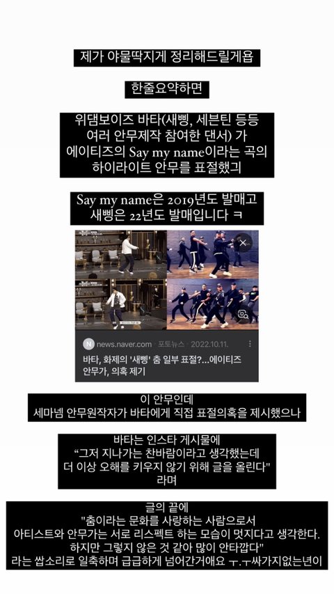 에이티즈 세마넴 2019.01.15발매 바타 새삥 2022.09월 심지어 에이티즈는 저 노래가 신인 때 해투 하면서 해외 안무가한테 받아온거임 심지어 해외 안무가도 표절이라고 말했는데도 당시 에이티즈가 지금보다 한국 인지도 덜해서 묻혔었고 에이티즈 멤버들 중에서 바타한테 춤배운 멤버도 있었음 근데 지금 바타는 3년째 표절 인정 사과 없음 이 정도면 팬들도 ㅈㄴ 오래기다린거임 오죽했으면 우영이 표절논란뜨고 세마넴 매 무대 후렴 안무 출 때 카피 사인함