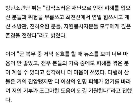 이미 단체로 할때 각각 10억 이상 냈고 세금도 잘 내고 국방의 의무도 잘하는데 기부로 왜 ㅈㄹ인지 모르겠음 기부는 강요가 아니라 솔직히 안 해도 뭐라 못 하는데 심지어 안 한것도 아님 기부로 ㅈㄹ하는 애들 봐 연예인들 남돌여돌 가르고 기부금으로 줄세우고 걍 제정신이 아님