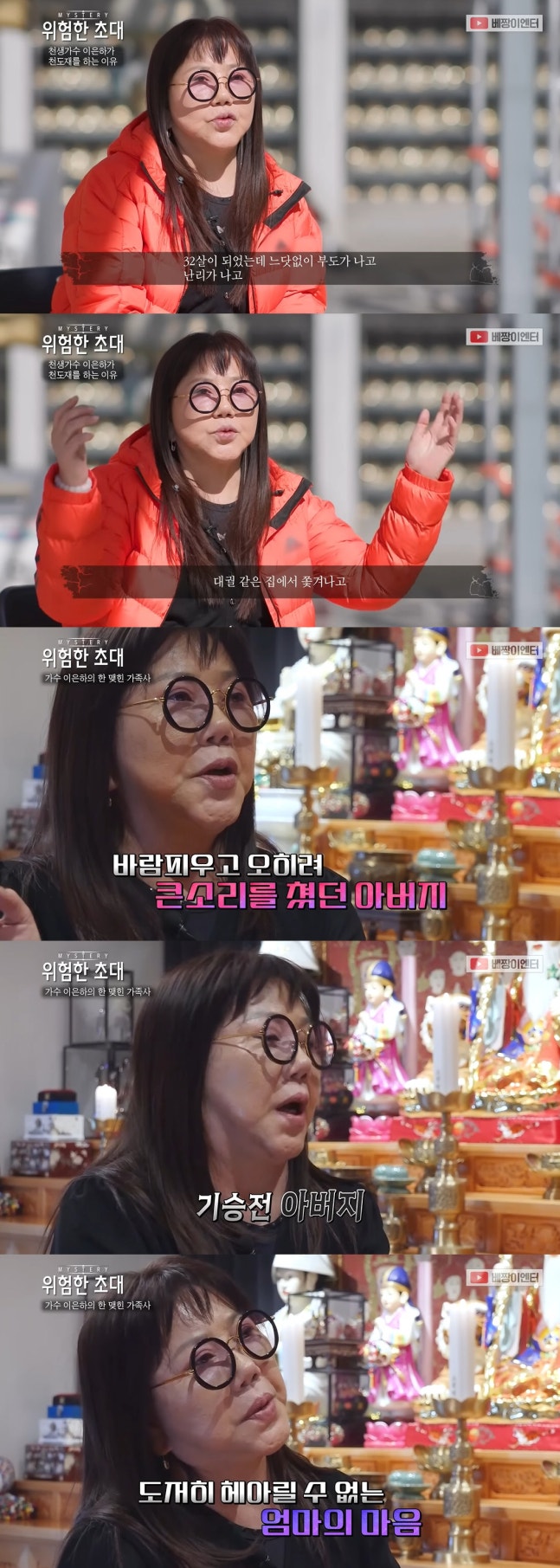30일 '베짱이엔터테인먼트' 채널에는 '가수 이은하! 부모님 천도재 중 터져나온 분노와 설움'이라는 영상이 공개됐다.