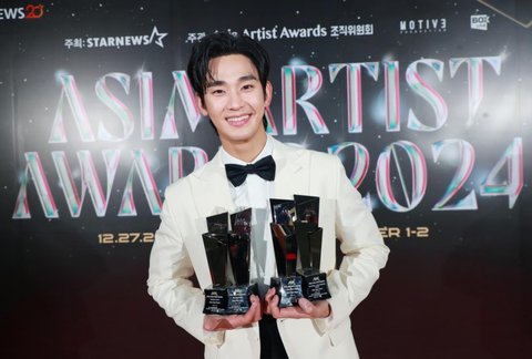 배우 김수현이 지난해 12월27일 오후 태국 방콕 임팩트 챌린저 홀 1-2(IMPACT Challenger Hall 1-2)에서 진행된 '제9회 아시아 아티스트 어워즈'(The 9th Asia Artist Awards, 이하 'AAA 2024')에서 AAA 핫트렌드, 페뷸러스, 베스트 아티스트, 올해의 배우상을 수상한 뒤 포즈를 취하고 있다./사진=스타뉴스.