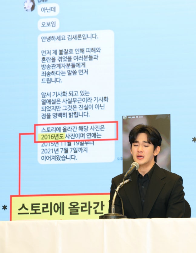 [서울=뉴시스] 김혜진 기자 = 배우 김수현이 31일 오후 서울 마포구 스탠포드호텔에서 기자회견을 열고 자신을 둘러싼 의혹에 대해 입장을 밝히고 있다. 2025.03.31. jini@newsis.com /사진=김혜진김수현은 "유족 측은 저에게 소아성애자, 미성년자 그루밍 이같은 프레임을 씌우고 있다. 그러나 2016년 카톡과 2018년 카톡에서 고인과 대화하고 있는 인물은 서로 다른 사람이다. 저는 이 사실을 증명하고자 유족이 제출한 2016년과 2018년 그리고 올해 제가 지인들과 나눈 카톡을 과학적으로 진술을 분석하는 검증기관에 제출했다. 그 결과 해당 기관은 2016년과 2018년 인물이 같은 사람이 아니라는 결론을 내렸다"라며 "유족들의 폭로가 시작된 후로 가장 괴로운 건 저와 소속사가 유족의 증거에 대한 입장을 내면 갑자기 새롭게 녹음된 증언과 증거가 공개된다는 것이다. 사건 시점을 교묘히 바꾼 사진과 영상, 그리고 원본이 아닌 편집된 카톡 이미지가 증거로 나온다. 제가 고인과 교제했다는 것을 빌미로 가짜 증언과 가짜 증거가 계속되고 있다"라고 오열했다.