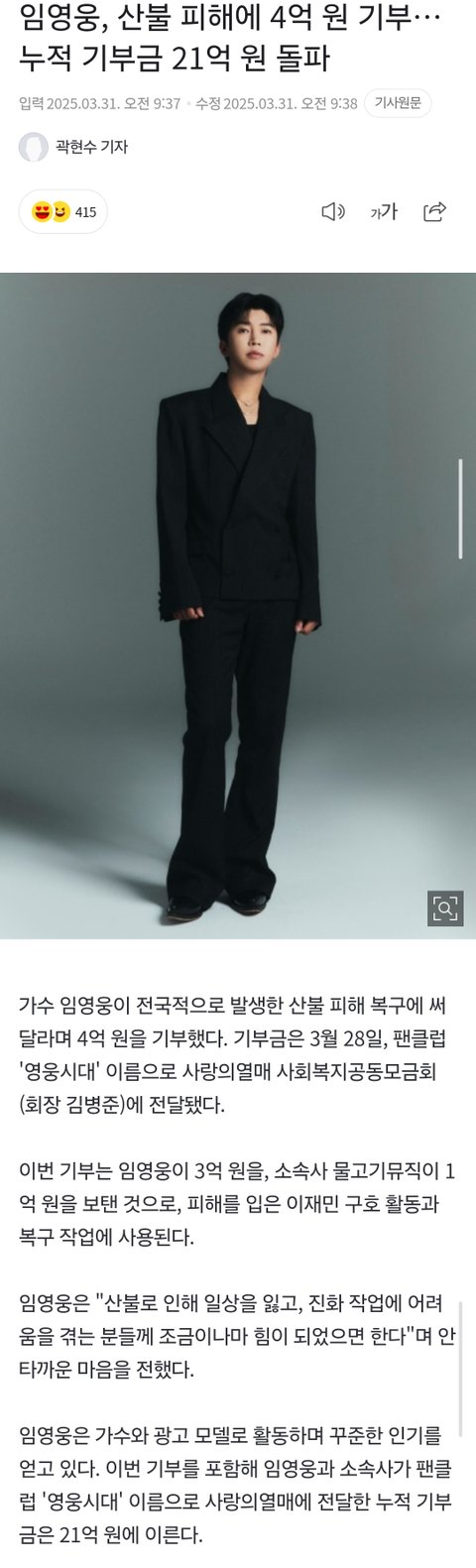 원래 꾸준히 매년 기부함 작년만해도 12월에 불우이웃 성금 3억냈고 5월에도 2억 하나자선축근 수익금 12억도 기부했음 무명시절부터 아침마당 상금 그 몇배도 기부한 사람임