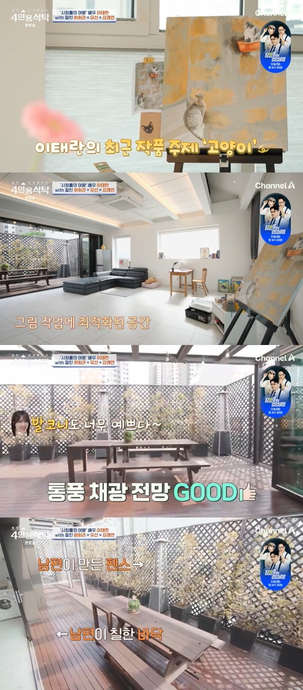 이태란이 직접 그린 그림들이 가득해 갤러리 같은 분위기를 풍기는 공간에서 모인 이들. 이태란에게 그림을 권한 하희라는 “너도 고양이 그리니? 나도 요즘 고양이 그리고 있다”며 반색했다. 예쁜 발코니도 감탄을 자아냈고, 이태란은 “남편이 손재주가 좋다. 저를 위해서 테라스 펜스를 만들어 걸었다”고 남편의 손재주도 자랑했다. (사진=채널A ‘절친 토큐멘터리 4인용식탁’ 캡처)