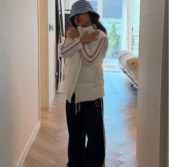 하임 양은 하늘색 버킷햇에 오렌지 스마일 포인트, ‘YALE’ 패딩 베스트, 트랙 라인이 들어간 맨투맨, 그리고 캐주얼 조거 팬츠까지 완벽한 스트리트 룩을 선보였다.사진=백지영 SNS