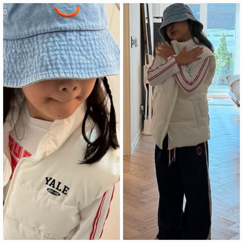 하임은 그에 맞춰 장윤주 헬스장 몸개그까지 직접 시전하며 싱크로율 100% 퍼포먼스를 보여줬고, 보는 이들 모두를 ‘찐웃음’으로 몰아넣었다.사진=백지영 SNS사진 속 하임 양은 하늘색 버킷햇에 오렌지 스마일 포인트, ‘YALE’ 패딩 베스트, 트랙 라인이 들어간 맨투맨, 그리고 캐주얼 조거 팬츠까지 완벽한 스트리트 룩을 선보였다.여기에 팔짱 끼고 자기애 폭발하는 포즈, 입술을 오므린 포토제닉 표정까지 더해지며 “어린이 힙합 요정” 그 자체의 무드를 완성했다.