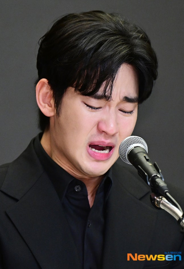 기자회견 중인 김수현(뉴스엔DB)앞서 김수현은 소속사 골드메달리스트 법률대리인 법무법인(유한) 엘케이비앤파트너스 김종복 변호사와 함께 31일 오후 서울 마포구 상암동 스탠포드호텔에서 기자회견을 개최했다. 김새론 유족 측이 '가로세로연구소' 채널을 통해 김새론이 미성년자였던 15세부터 김수현과 6년간(2015년~2021년) 교제했다며 사적인 사진을 공개하며 파문이 일었기 때문이다. 당초 김수현 측은 열애 사실 자체를 부인했으나 사진이 공개되자 "김새론이 성인이 된 이후인 2019년 여름부터 2020년 가을까지 교제했다"며 입장을 번복했다. 기자회견에서도 김수현은 "저와 고인은 5년 전, '눈물의 여왕'이 방영되기 4년 전 1년 여 정도 교제했다"며 재차 의혹을 전면 부인했다.