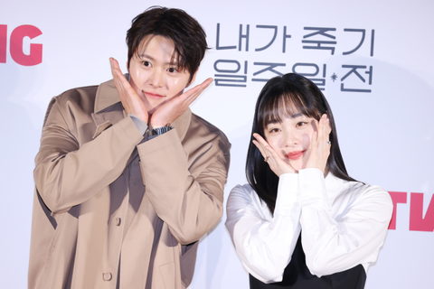 배우 공명과 김민하가 1일 오전 서울 용산구 CGV용산아이파크몰에서 열린 티빙 오리지널 시리즈 ‘내가 죽기 일주일 전’ 제작발표회에서 포즈를 취하고 있다. 사진 연합뉴스
