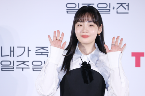 배우 김민하가 1일 오전 서울 용산구 CGV용산아이파크몰에서 열린 티빙 오리지널 시리즈 ‘내가 죽기 일주일 전’ 제작발표회에서 포즈를 취하고 있다. 사진 연합뉴스