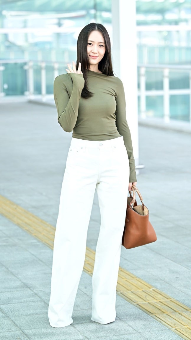크리스탈의 공항패션은 봄 느낌이 물씬 났다. 비대칭 오프숄더 넥라인과 롱 슬리브 디자인이 돋보이는 톱을 매치, 잘록한 허리라인이 돋보였다. 여기에 미드 라이즈의 릴렉스 와이드 레그 실루엣의 화이트 데님을 착용해 화사함을 더했다.