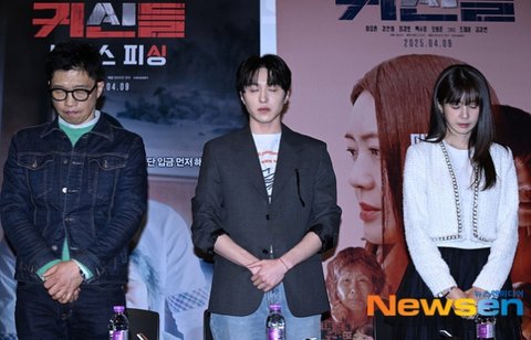 [뉴스엔 유용주 기자] 배우 정경호, 강찬희, 이요원이 4월 1일 오후 서울 용산 CGV용산아이파크몰에서 열린 영화 ‘귀신들’ 언론 시사회 및 기자간담회에 참석해 간담회를 가지며 故 이주실 배우에 대한 묵념을 하고 있다.