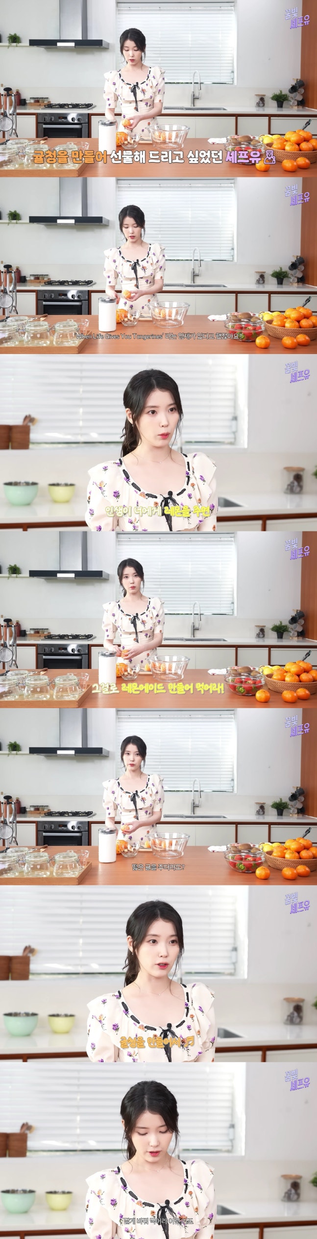 이날 아이유는 지난 7일 공개된 넷플릭스 드라마 '폭싹 속았수다'에 대해 "귤과 연관되어 있는 작품이다. 영어 제목도 'When Life Gives You Tangerines'이다"라고 설명한 뒤 귤푸딩과 귤청을 만들기 시작했다.아이유는 "이 콘텐츠를 하자고 한 이유가 보검 씨, 해준 선배, 소리 선배님께 드리고 싶어서였다"면서 "저희 드라마가 'When Life Gives You Tangerines'라는 영제가 있다고 하지 않았냐. 그게 무슨 뜻이냐면 이게 원래 미국 속담인데 '인생이 네게 레몬을 주면 그걸로 레몬에이들름 만들어 먹어라'라는 거다. 우리 말로 바꾸면 떫은 귤을 주면 귤 차나 귤 에이드로 바꿔먹어라 이정도 될 것 같다"라고 말했다.