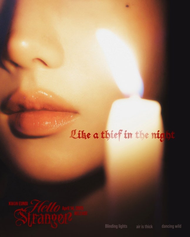 여기에 붉은색의 강렬한 폰트로 새겨진 'Like a thief in the night'라는 문구는 신비감을 한 스푼 더했다. 권은비의 촉촉한 입술과 오묘한 감성이 어우러진 커밍순 이미지가 그가 새롭게 선보일 음악과 콘셉트에 대한 호기심을 강하게 자극했다.