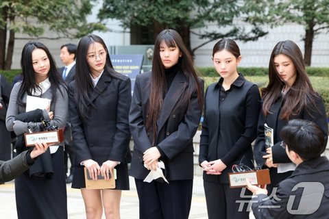 뉴진스 멤버 5명은 지난달 7일 가처분 심문기일에 직접 법정에 출석했지만 이날은 모습을 드러내지 않았다. 민사 소송은 형사 재판과 달리 당사자 출석 의무가 없다.