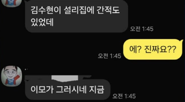 A씨와 대화하는 상대는 "김수현이 설리 집에도 왔었대"라고 말한 모습. A씨가 "진짜요?"라고 반문하자 상대는 "이모가 그러시네"라고 답했다.