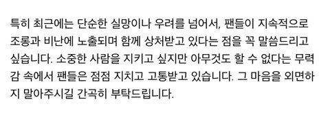 진짜 컴백한 후로 억까 조롱 인신공격 허위사실유포 심지어 아직도 ㅁㅇ억까 ㅈㅅ드립 등등 입에 담지도 못할 악플들
