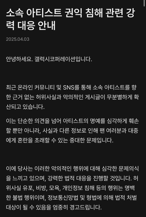 소속사 법적대응 고소 강경대응 들어감 선처 절대로 없대