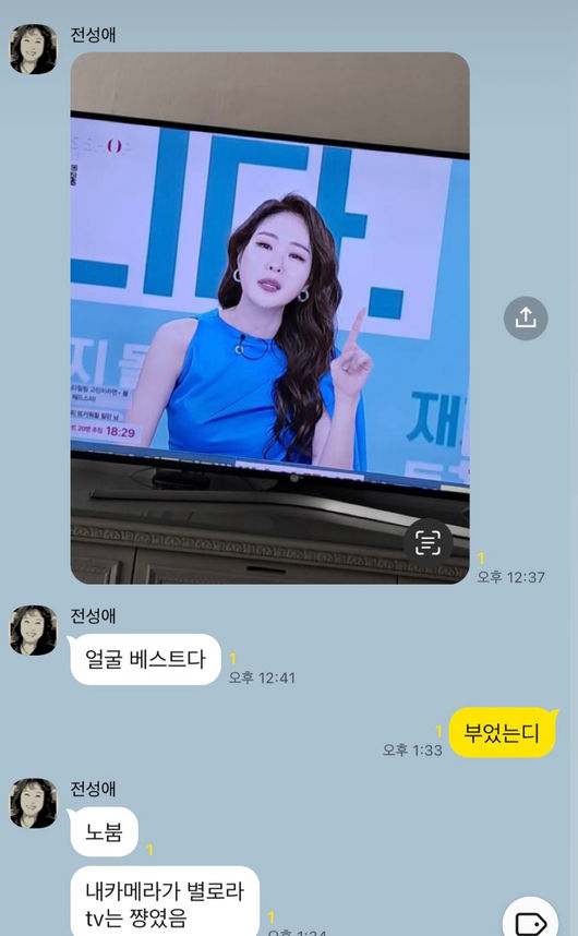이어 공개한 카카오톡 캡처 첨부 사진에서, 어머니인 배우 전성애는 미자의 미모를 칭찬했다. 미자는 어머니가 찍은 자신의 사진에 대해 의문을 가졌으나, 어머니는 자신이 잘못 찍은 것이라고 말했다. 미자는 이에 대해 "엄니가 칭찬을"이라며 감격해했다.
