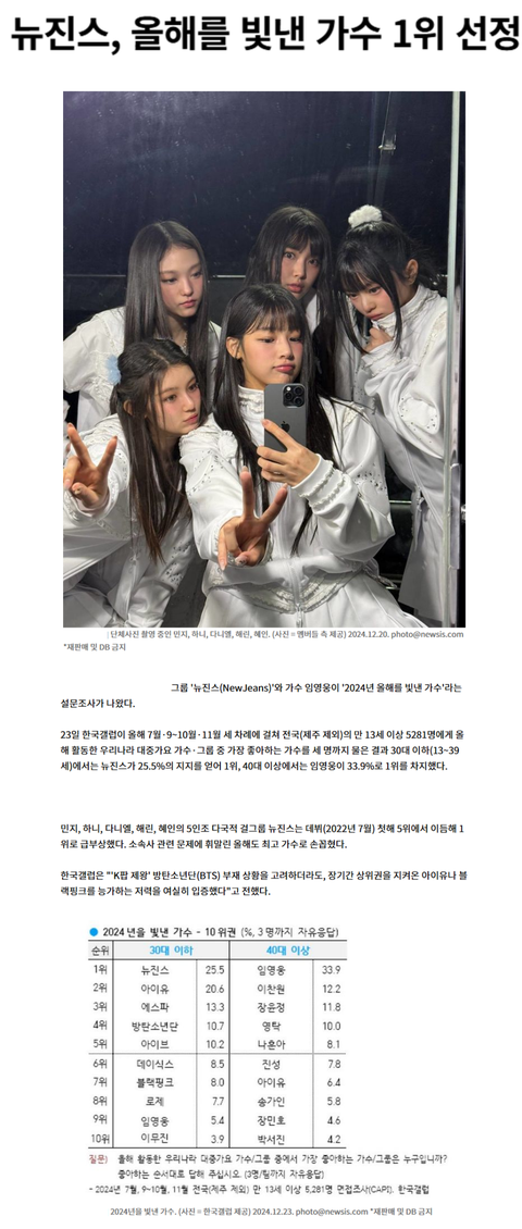 솔직히 갤럽조사1위인데 그인기가 어디가겠냐? 어차피 대중들은 소송건도 잘 모르고 아직도 하입보이,디토좋아라듣고 이번나온 신곡도좋고 현실에서는 뉴진스 대중이미지 탑이라 데미지 거의없지