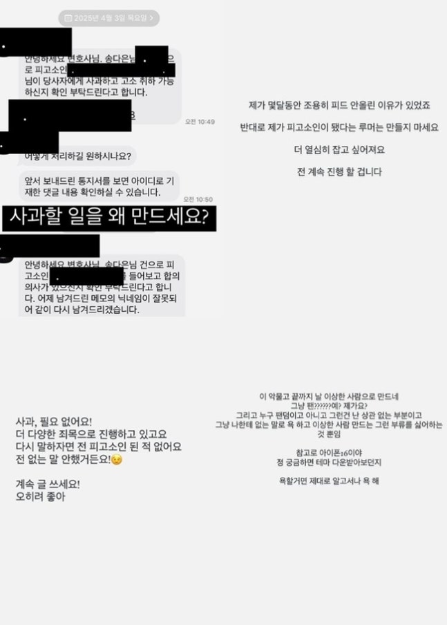 함께 공개된 사진에는 피고소인이 "당사자에게 사과하고 고소 취하 가능하신지 확인 부탁드린다고 합니다" 같은 메세지를 받은 정황도 담겼다. 송다은은 수사결과통지서를 받은 내용과 함께 이를 공개하며 "사과할 일을 왜 만드세요?"라고 되물었다.