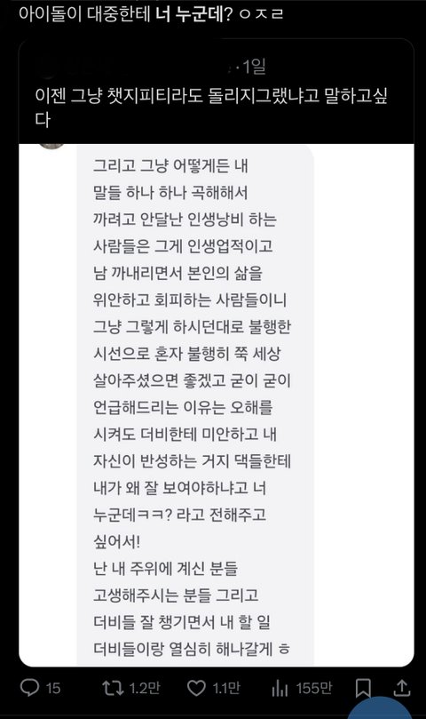 ???? 아이돌이라고 저런 말 못함? 개오바네 오늘 초면이고 누군진 모르겠지만 뭐가 잘못됨? 아이돌을 그냥 사람이 아니라 AI라고 생각하나보노