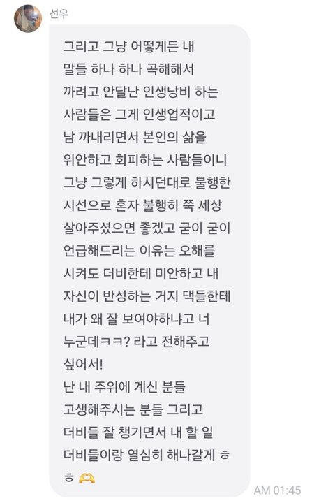 야ㅅㅂ얘네가 다 너네같을줄아냐 악플 단 판년들이 설리조문웅애웅ㅇㅈㄹ 안쓴애도있어 니네가 썼더고 얘네도 써재낀거아님 그리고 썼던애..