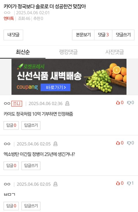위로 댓❌️ 카이팬 정국팬도 아니고 걍 둘 이간질 시키고 싶은 어그로임 그와중에 댓으로 정국팬인척 이간질은 하고 싶은데 아이디 안바꾸고 댓글써서 쓰니 자분쇼티남 먹금하고 반대 신고만