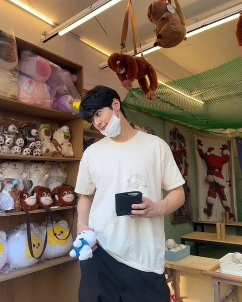 사진에서 차은우는 유원지를 방문한 듯 여유로운 일상을 공개했다. 야구공을 던져 인형을 획득한 듯 허리에 강아지 인형 키링을 달았고, 오리 건지기 게임을 통해 획득한 오리 머리띠도 야무지게 착용하며 잔뜩 신난 모습이다.