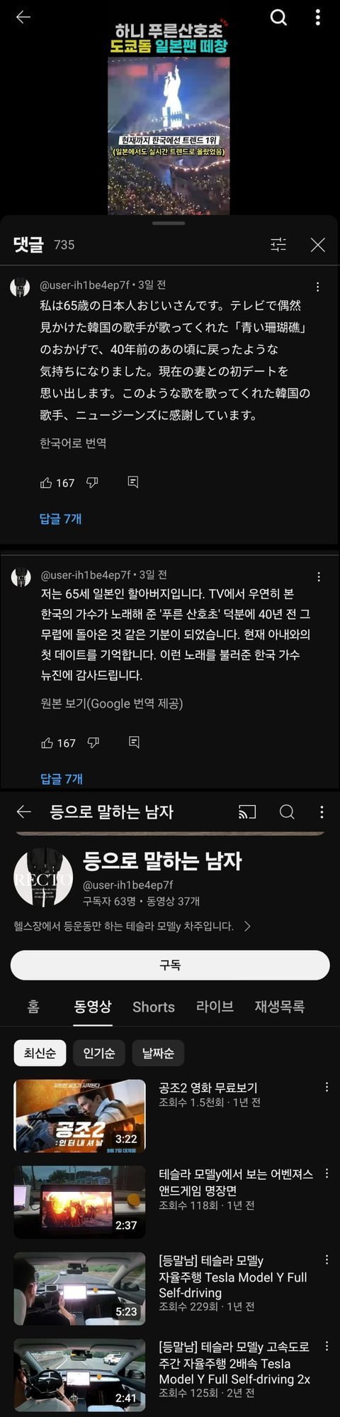 저런 국뽕바이럴 좋아죽는 40대이상 개저개줌팬덤은 따로 있는데 왜 수치심은 내가 느껴야하는 거냐고.. 진짜 저 나이먹고 아이돌 빤다고 일본인인척 국적팔아먹고 저러는 거 자괴감 안오나? 유튜브 소개까지 모델y 차주입니다 ㅇㅈㄹㅋㅋ 저런 개저개줌들만 국뽕먹고 뉴진스빠나봄