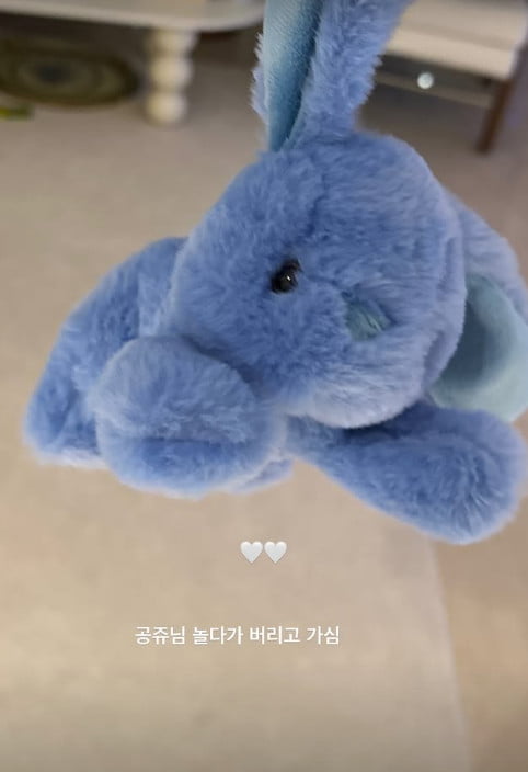 공개된 사진 속에는 푸른색 토끼 인형을 이유비가 들고 있는 모습. 특히 인형 주인을 '공주님'이라고 칭한 것으로 보아 이날 이유비의 집에 이승기와 이다인 부부의 딸이 다녀갔음을 짐작케 했다.