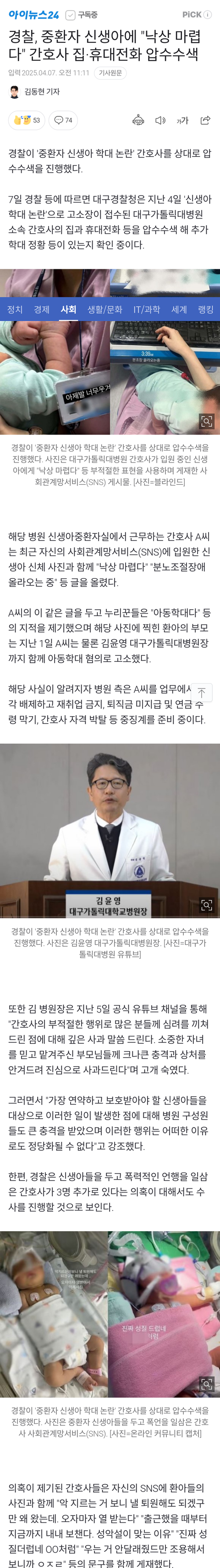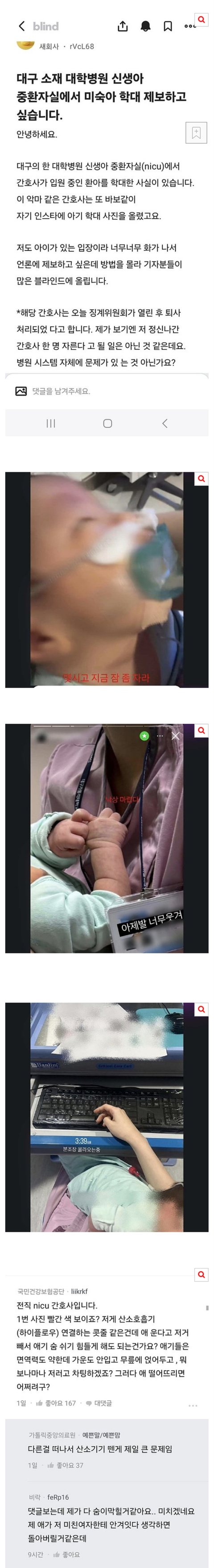 오늘 뉴스보니 압수수색 들어갔다더라. 애기 운다고 산소줄 빼고 사진 찍고 그랬다고. 여럿 감옥갈 것 같던데 단톡방에 3명 더 있단다.