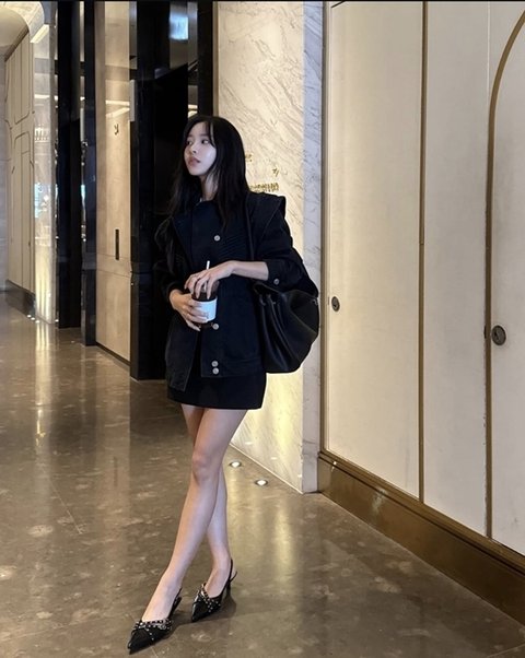 군더더기 없이 매끈한 각선미와 절제된 스타일링은 도회적인 분위기를 한껏 끌어올렸다. 손에 커피를 든 채 로비에 서 있는 모습만으로도 남다른 분위기를 자아냈다. 여기에 포인트가 된 스터드 장식의 블랙 슬링백 힐은 그녀의 당당한 무드를 더했다.무심한 듯 시크한 표정과 반듯하게 뻗은 실루엣, 그리고 전체적인 컬러 톤까지. ‘호텔 라운지 여신’이라는 수식어가 자연스러울 정도였다.
