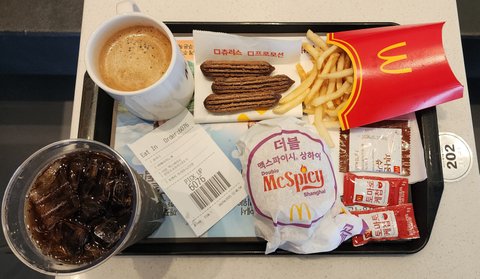 (사진3 설명) 저는 오늘(2025.04.04(금)) 미국 트럼프 대통령께서도 좋아하시는 맥도날드 햄버거를 먹기위해 근처에 있는 맥도날드 매장에 들른 후 '더블 맥스파이시 상하이'를 점심식사했습니다. '더블 맥스파이시 상하이' + 코카콜라 + 감자튀김 + 아메리카노 커피 + 'I love 츄러스' <-- Good! <촬영정보: 셔터속도 1/180s, 초점거리 23mm, 조리개 f1.8, 촬영감도 ISO 160, 삼성 Galaxy S22 Ultra 렌즈 사용, 촬영일자 2025.04.04(금) 오후 13:04, 최대우 촬영, 주소: 서울시 송파구 도곡로 434(잠실동)>