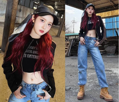 여기에 빈티지 워싱의 루즈핏 찢청 데님과 무게감 있는 브라운 워커, 스카프 디테일의 캡 모자를 더해 완벽한 힙합 스트리트룩을 완성했다. 무엇보다 시은의 레드 컬러 웨이브 헤어는 시선을 압도하며 이번 컴백 콘셉트를 단번에 설명해주는 포인트가 됐다.