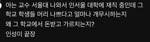 걍 인서울 중위권 대학생인데 교수들 싸가지 ㄹㅈㄷ 임 맨날 우리과 애들 100명 데려와도 서울대 카이스트대 한명 몫도 못한다 이럼ㅋㅋㅋㅋ 늙은 교수들이 진짜 인성 개파탄났고 애들 학생들 무시함.. 사회성 없다고 느낀게 저번에 동기가 교수랑 카페갔는데 거기서 대놓고 짜증을 부렷다는게 하...ㅋㅋ