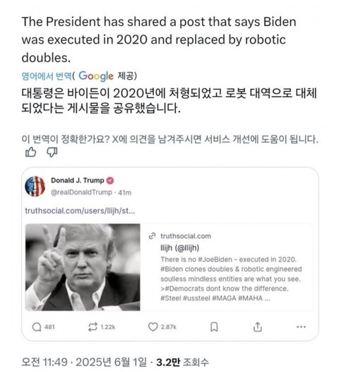 2024년 초에 진짜 도널드 트럼프 죽이고 해외재벌들과 손잡고 부정선거해서 가짜 대역 트럼프 미국 대통령으로 세운 북힌간첩들 가짜 대역 트럼프들과 미국 부정선거한거 다 터질각 뜨니까 바이든 대역거리며 미러링하고 미국 계엄 군사 쿠데타 터뜨릴려고 애쓰는 중임