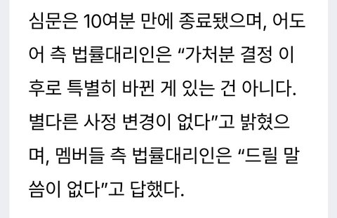 어도어 측 법률대리인은 심문을 마치고 “가처분 결정 이후로 특별히 바뀐 것은 없다”라고 전하면서도 구체적으로 어떤 의견이 오갔는지에 대해서는 말을 아꼈다. 뉴진스 측 법률대리인은 침묵을 지키며 법원을 빠져나간 것으로 전해졌다.